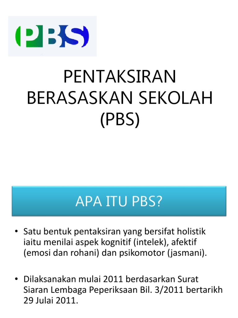 10 Pengenalan PBS. Sistem baru yang diperkenalkan oleh Kementerian Pendidikan Malaysia pada tahun 2012 bagi Tingkatan 1 dan pada tahun 2011 bagi Tahun 1 adalah lebih dikenali sebagai Pentaksiran Berasaskan Sekolah PBS. A BPG akan memaklumkan kepada semua Jabatan Pelajaran Negeri JPN tentang Pengalaman Berasaskan Sekolah PBS.